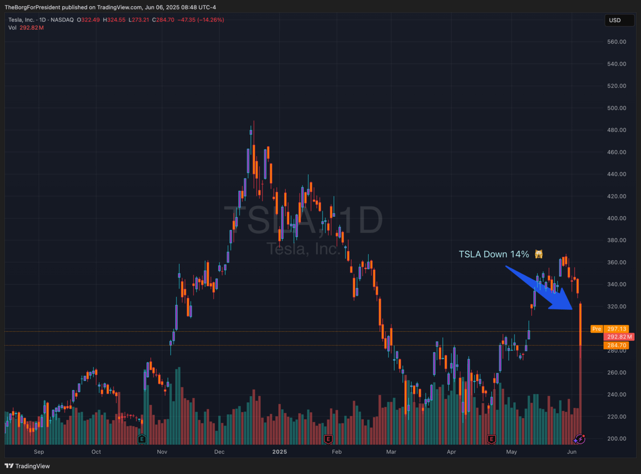 It then escalated into a full-on social media feud. Trump kicked off the feud, stating he asked Musk to leave because he was “wearing thin.” Musk then retorted by implying Trump was a pedophile when he tweeted about releasing the Epstein list, showing that Trump was named. This caused a 14% drop in stock. See below