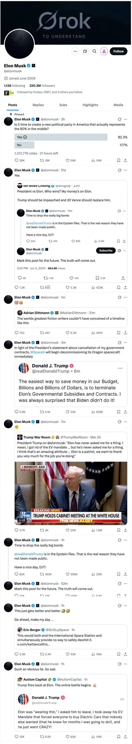 A screenshot of Musk’s X account showing a timeline of the online spat between Musk and Trump. Is this MAGA Bromance in trouble?